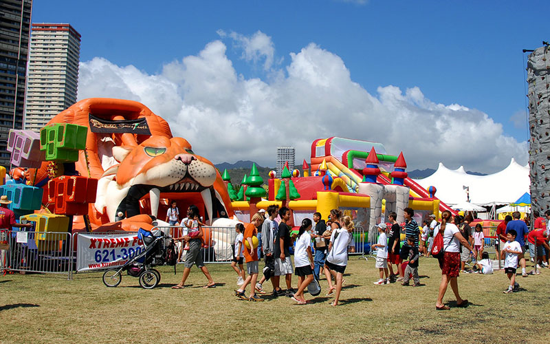 After the initial design of inflatable jumping castle hit the markets in the 1970s and 80s, party rental companies started to capitalize on the trend and began designing various other fun inflatable structure for parties and events, such as inflatable dry slides and water slides, bounce house with slide combos, crazy inflatable obstacle courses and mazes, interactive sport games and water games, etc. Various styles and designs for you to choose from when planning a child’s birthday party. This is what’s so unique and diverse about inflatable equipment in the present day.